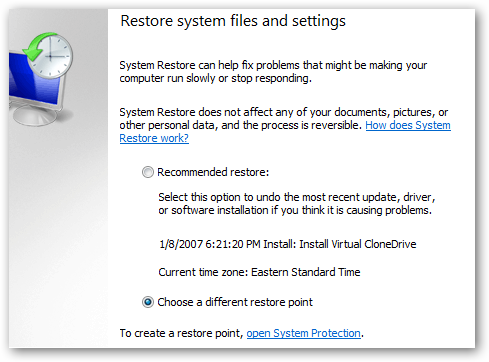 System Restore helps you restore your computer's system files to an earlier point in time. It's a way to undo system changes to your computer without affecting your personal files, such as e‑mail, documents, or photos