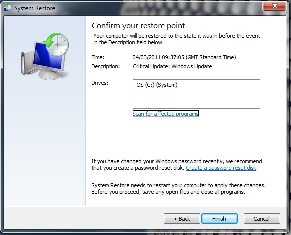 System Restore helps you restore your computer's system files to an earlier point in time. It's a way to undo system changes to your computer without affecting your personal files, such as e‑mail, documents, or photos